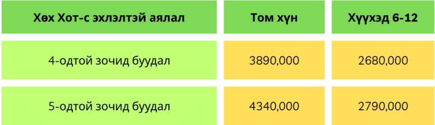 - 5-одтой эсвэл 4-одтой зочид буудалд байрлах төлбөр, өглөөний цайтай.Өрөө нь 1 өргөн эсвэл 2 нарийн ортой байх ба 2 том хүн 1-2 хүүхэд байрлана.